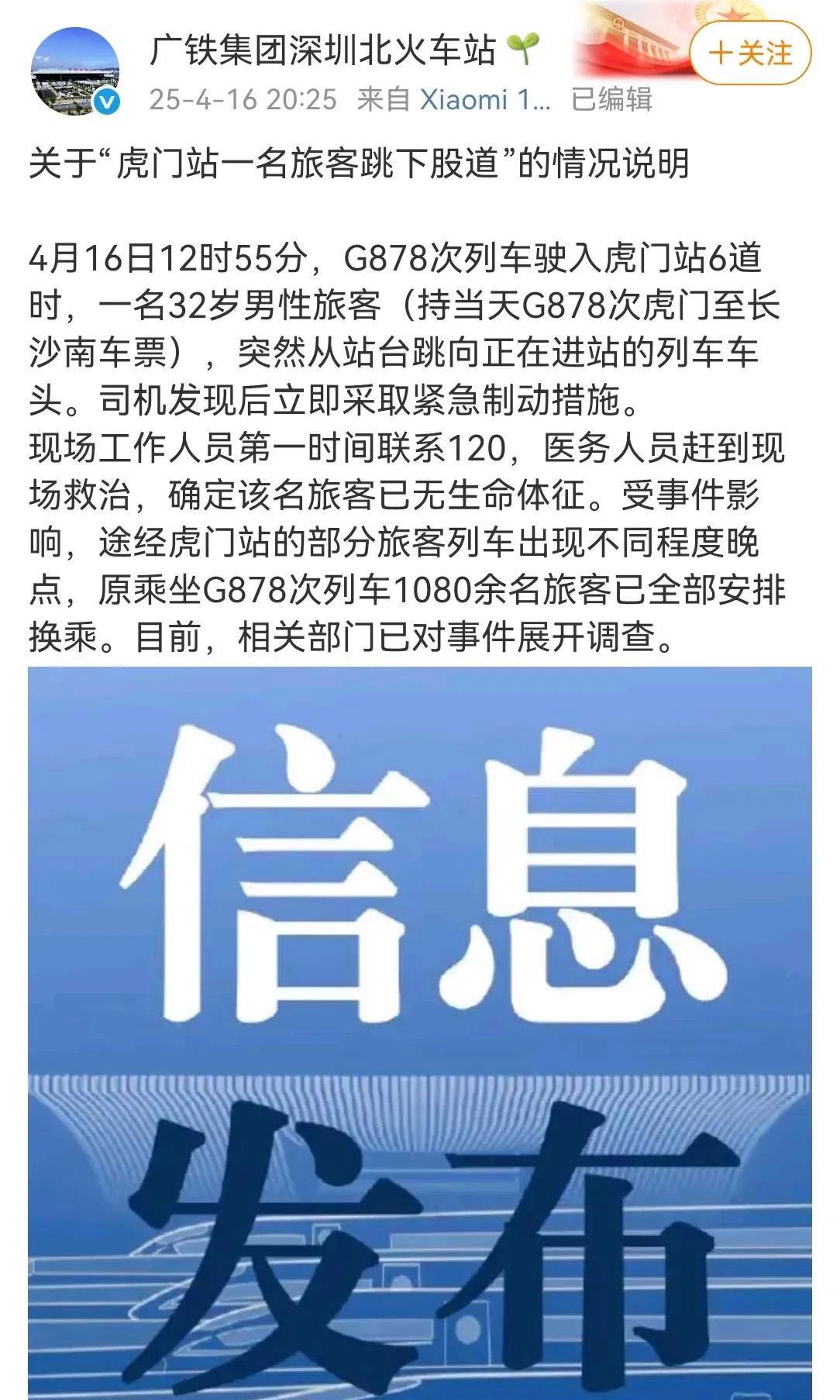 4月16日中午,虎门站6站台的监控录像显示,G878次列车以每小时120公里的速度缓缓进站。阳光在钢化玻璃上折射出刺眼光斑,候车乘客的影子被拉成扭曲的剪影。突然,一道人影从黄色安全线外腾空而起,像被无形巨手抛向轨道。