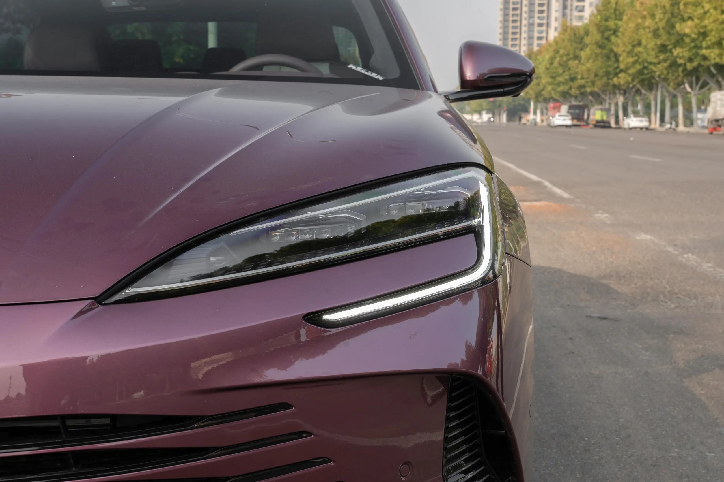 外观方面,海豹07 DM-i采用了家族“海洋美学”设计语言,并融入了OCEAN X的设计元素,机盖上有着四条明显的筋线,BYD的标识十分醒目,LED大灯带有自动头灯、自适应远近光、转向辅助灯,而横向多层无边界格栅拉宽了视觉效果,前包围两侧的导流槽可降低风阻。