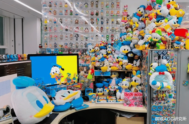 北京互联网大厂的唐老鸭狂热粉,用数百件唐老鸭的周边将L型工位改造成“主题乐园”:键盘旁站着辉儿杜儿路儿三兄弟,显示器上趴着黛西的玩偶,连文件柜都成了唐老鸭手办的陈列馆。