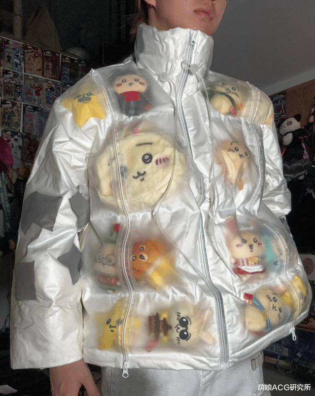 小红书博主@World peace 的“痛衣”则是行走的周边展示架。这件吉伊卡哇联名外套,布满透明收纳格,让心爱的娃们能“坐”在肩膀上陪主人开会、挤地铁、加班到深夜。