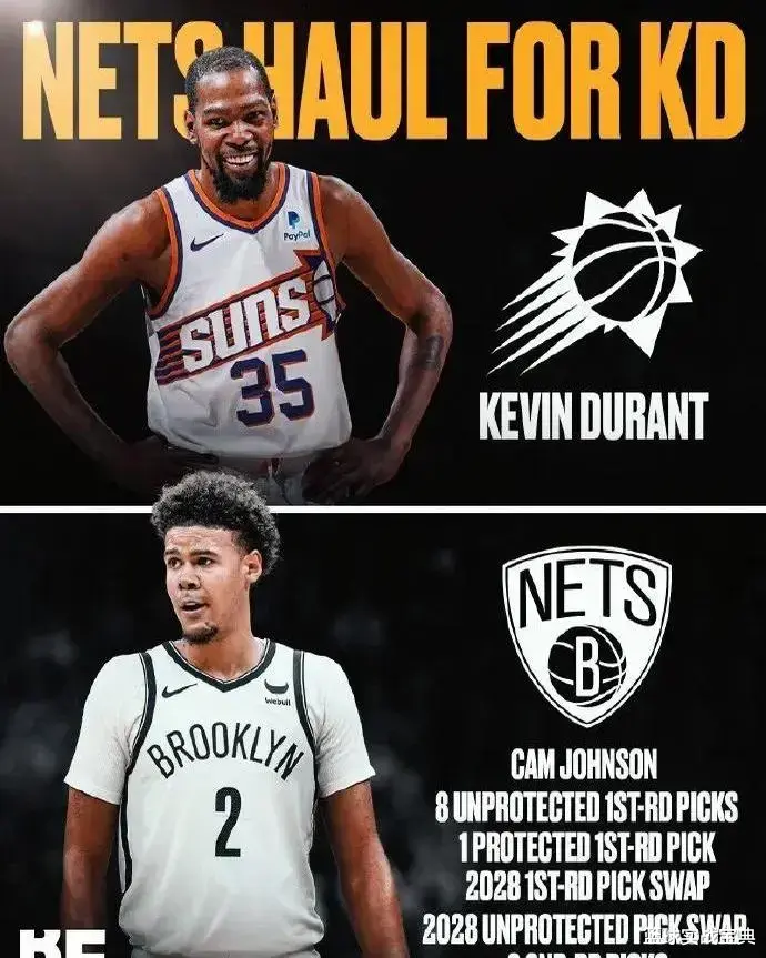 22-23赛季中期,太阳拆掉总决赛班底,打包送出布里奇斯+约翰逊+克劳德+4个首轮签+一个2028年选秀权互换,从篮网交易来杜兰特和TJ沃伦,如上所述这很显然是失败的赌局。