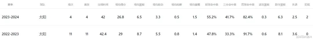 这位今年9月份就37岁的超巨,本赛季至今场均26.6分6板4.2助1.2帽,三项命中率52.7%、43%和83.9%。