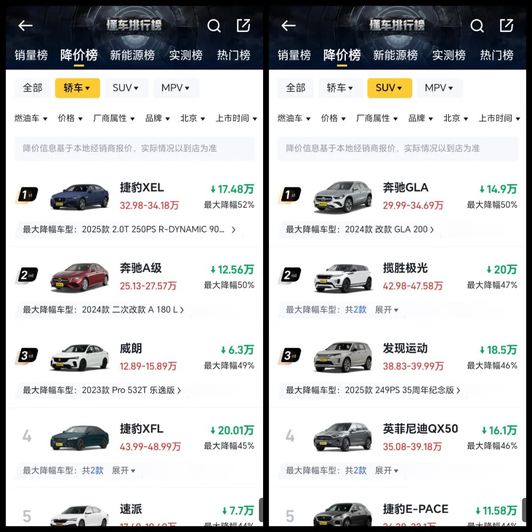 一线豪华品牌带头让利,二线迅速跟进血拼。现在,英菲尼迪QX50单辆车降价16.1万元,让利幅度高达46%;捷豹XEL最大降幅更达17.48万元,终端售价几乎腰斩。