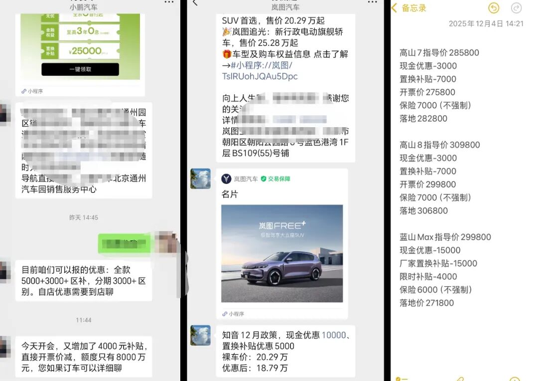 岚图的优惠同样可观。“知音12月政策,现金优惠10000元、置换补贴优惠5000元。以裸车价20.29万元的车型为例,优惠后仅需18.79万元。”岚图空间北京蓝色港湾店一名销售经理介绍道。