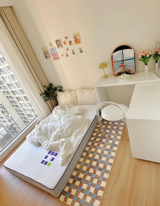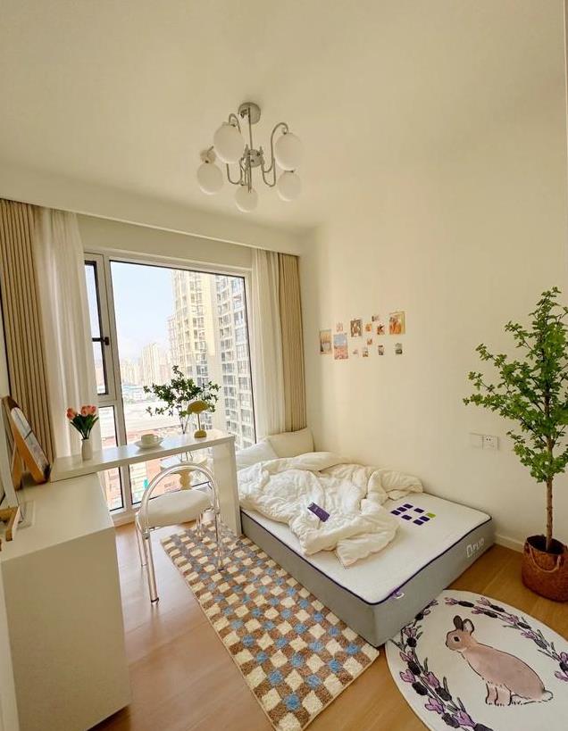 房间尺寸2.5*2.8 左边放置了一个1.2m规格的梳妆台,可以灵活调整摆放形式。右边没有要床架,大大的落地窗,1.2 m的床垫直接铺地上,加上极具包裹感的睡感,感觉像睡在了云朵里。 .