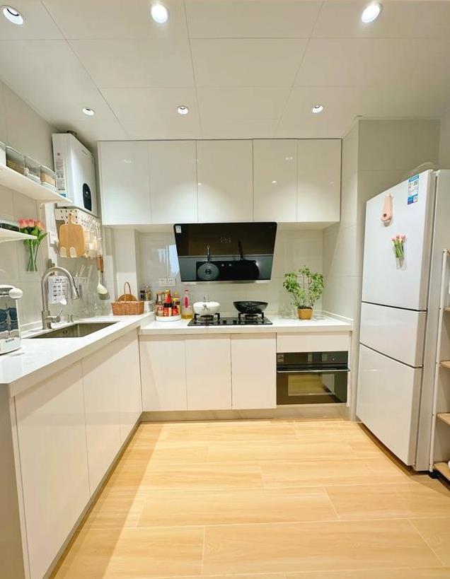 砖厨柜防潮耐用,高光白门板颜值高卫生好打理,小物件统统收纳上墙 。L型高低台设计,洗菜炒菜不费力,橱柜下方安装消毒柜代替拉篮,消毒置物二合一。