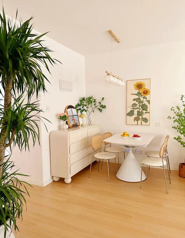 20%棕色系、70%暖白色系、10%的绿色装饰画及绿植做点缀,所有软装、家具、家电的外观颜色上的挑选,都不偏移这几个色系,整体搭配下来就会很协调。