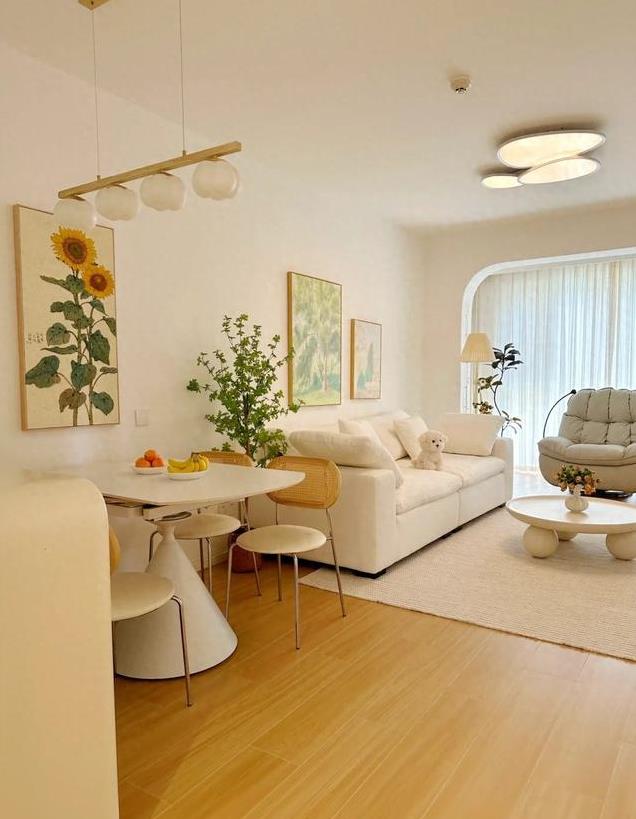 挂画和绿植为小家增添几抹绿意,双层亚麻+纱帘,透光不透人,温柔有质感 。 奶fufu的全友家居云朵沙发,和客厅很搭,也是自己和家人最喜欢待的地方。
