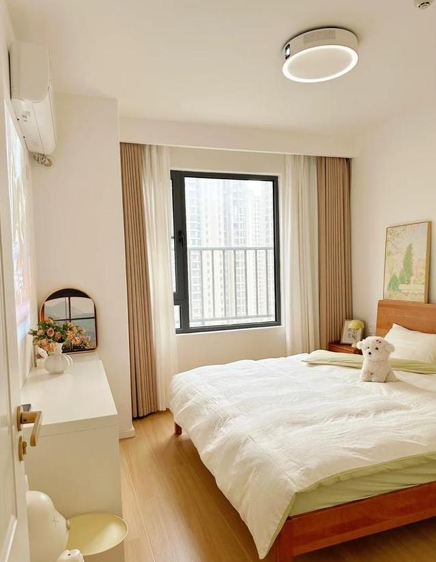 卧室拆除飘窗,可以让卧室多一点点的面积,别看面积并不多,将窗帘布置在这块区域,完全解放了其他区域,还能让卧室多摆放一个床头柜。