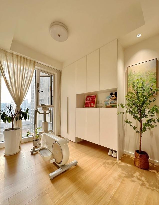 进门的位置有一个小小的入户花园,封窗改造成一个多功能区,设计整面墙的收纳柜后,剩下的空间摆放健身器械,做一个家庭健身区。