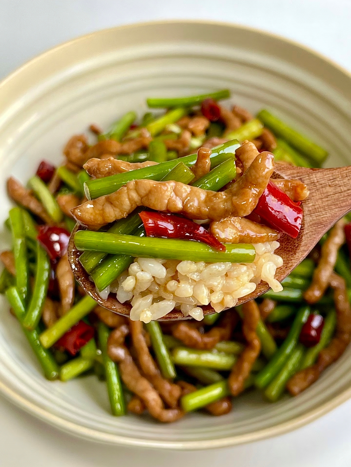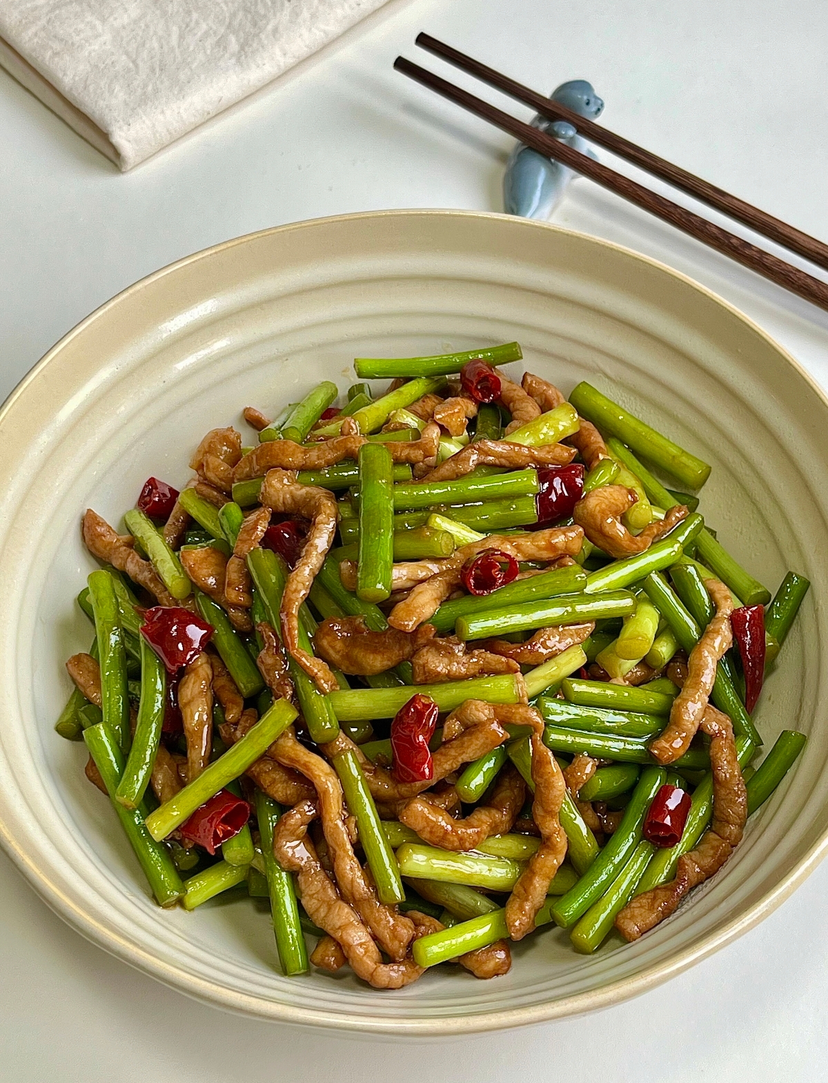 在快节奏的现代生活中,一人食的场景越来越多,如何在有限的时间和精力里,为自己做一顿热气腾腾、鲜香开胃的家常饭,成了许多人的小课题。而蒜苔炒肉丝这道菜,无疑是其中的佼佼者。它食材常见,做法简单,却能用最朴实的食材碰撞出令人惊艳的鲜味,脆嫩的蒜苔裹着肉香,咸鲜的酱汁浸润每一根肉丝,只需几分钟就能炒出一盘,拌上一碗热腾腾的米饭,瞬间就能抚慰疲惫的身心。