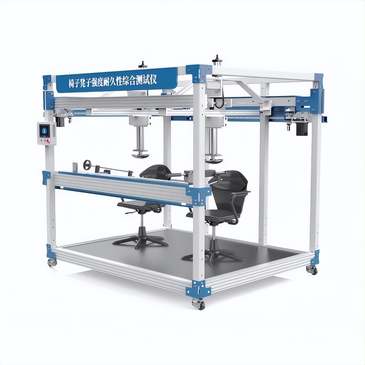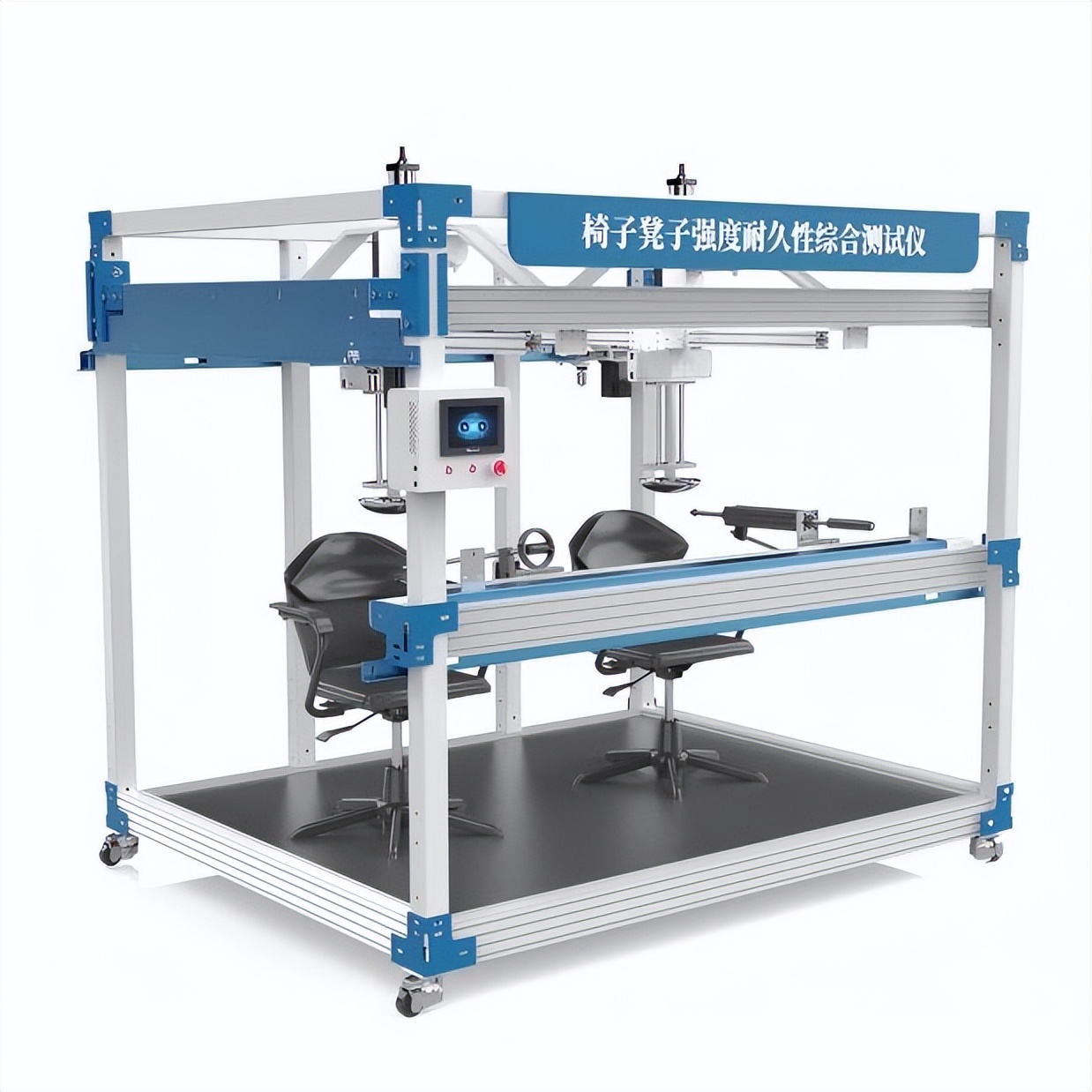 椅子凳子强度耐久性综合测试仪是用于评估椅凳类家具在长期使用中承受各种力学作用能力的专业设备,其通过模拟垂直压力、水平推力、冲击、旋转等实际使用场景,结合模块化设计和智能控制系统,可精准检测椅凳的结构强度、耐久性及稳定性,确保产品符合国际及国内安全标准。