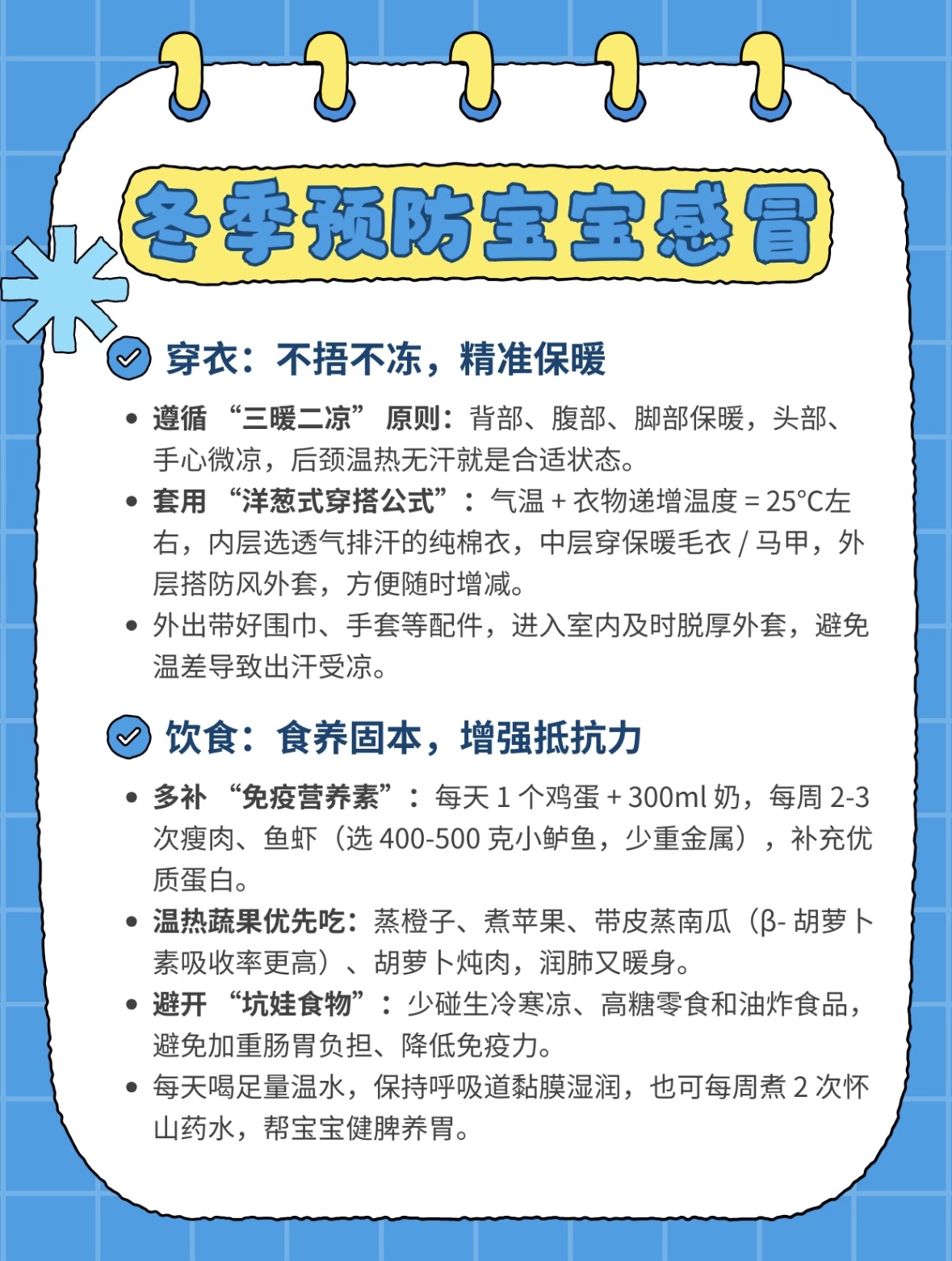 冬季防感冒,不是要让孩子生活在“无菌箱”里,而是要帮他们建立一套完整的防护体系。当孩子偶尔打喷嚏、流鼻涕时,别太焦虑,这是身体在“自我防御”。只要日常做好穿衣、环境、饮食和习惯的防护,孩子就能在冬天里安稳度过,少生病,多长个。这份清单不是任务,而是融入生活的温柔守护,愿每个宝贝都能在妈妈的呵护下,拥有一个健康温暖的冬天,让感冒病毒都“绕道走”。