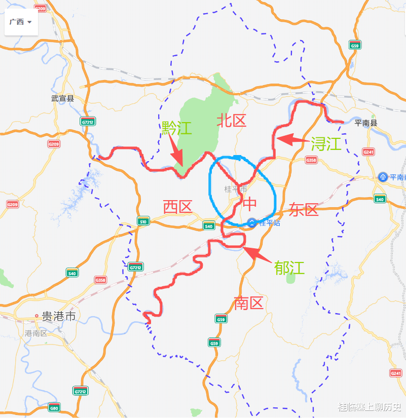 按三江六岸来说,就简单一些,一看地图就明白。黔江和郁江汇流形成的夹角为一个区域;黔江左岸和浔江左岸一个区域;郁江右岸和浔江右岸为一个区域。