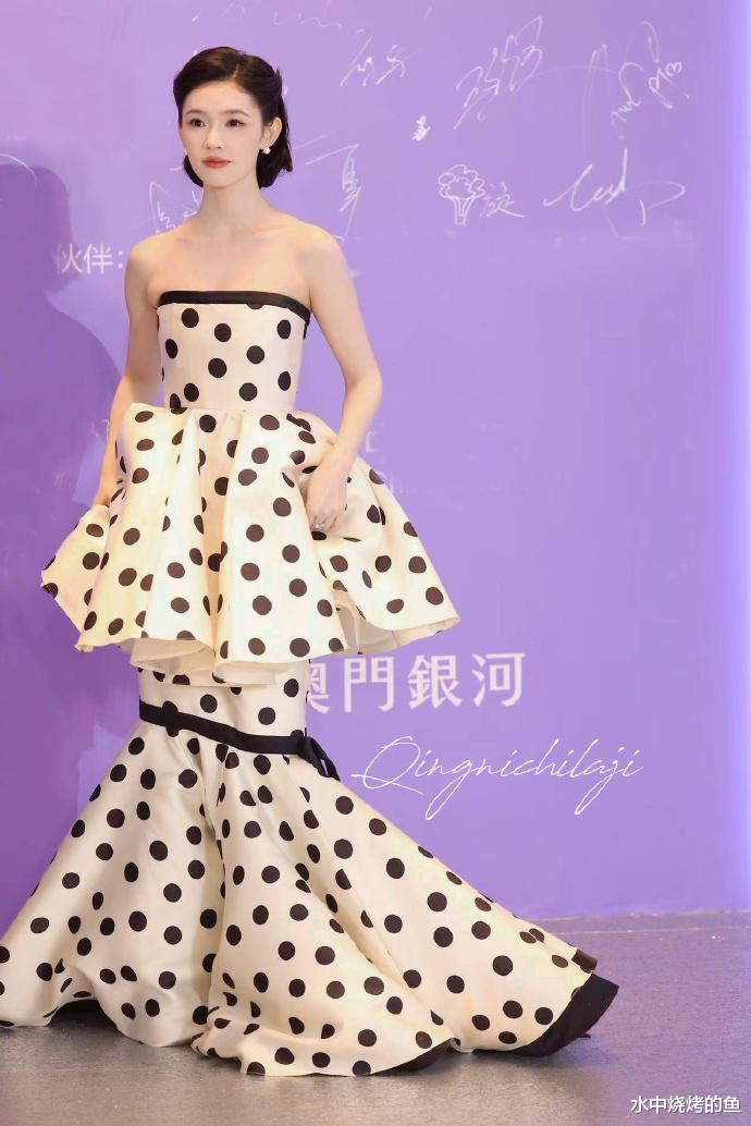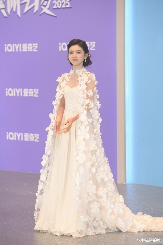 章若楠身着花朵薄纱披风礼服亮相,整个人的脸是精致的,风格也很甜美,不过个人风格和气场还是驾驭不起来这身礼服,有种“小孩穿大人衣服”的错乱感,发型也显得比较老气,和衣服的风格不搭配。
