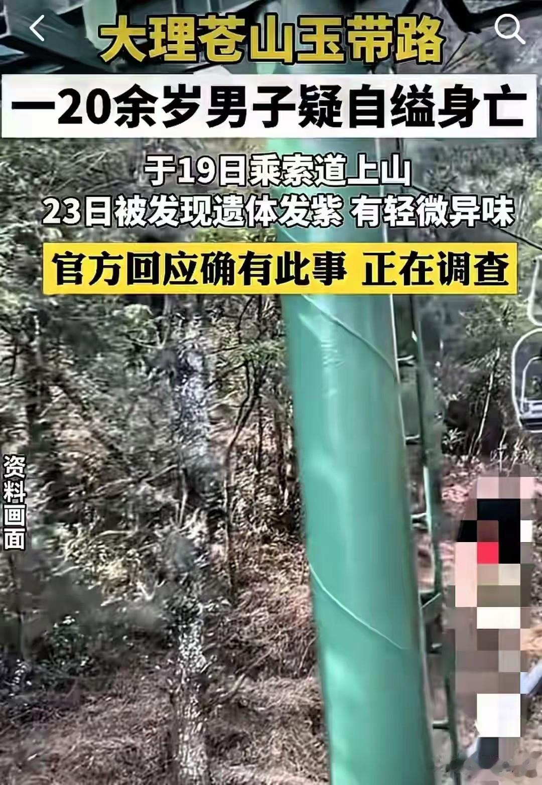 近日,有网友向媒体爆料称,在云南大理苍山玉带路发现疑似有人自缢身亡。