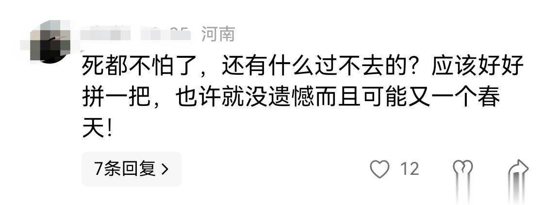 有网友说,死都不怕,还有什么过不去的?应该好好活着拼一把,也许就没有什么可遗憾的,说不定又迎来柳暗花明。