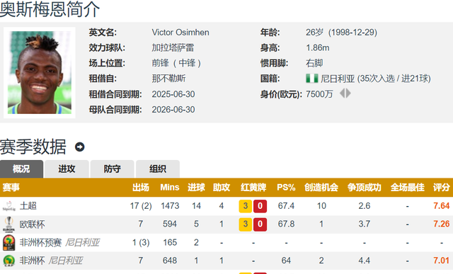 曼联本赛季表现糟糕,目前仅排名英超第十五位,球队的进攻火力明显不足。与此同时,奥斯梅恩在那不勒斯的处境也不理想,本赛季被外租至土超豪门加拉塔萨雷。他在土超的表现堪称高效,26场比赛中贡献20球5助,展现出重返五大联赛的实力和决心。