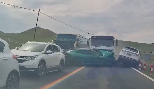 8月19日下午2点34分,内蒙古某公路发生严重连环撞车事故。根据现场行车记录仪画面显示,对向车道一辆罐车为躲避前方客车,突然失控冲入反向车道,迎面撞上一台全新宝石绿色小米YU7。撞击力度极大,罐车先是正面猛撞YU7,将其旋转180度后,又撞开一旁白色SUV,继续冲向后方车辆。幸好视频车司机反应迅速,紧急倒车躲过一劫。