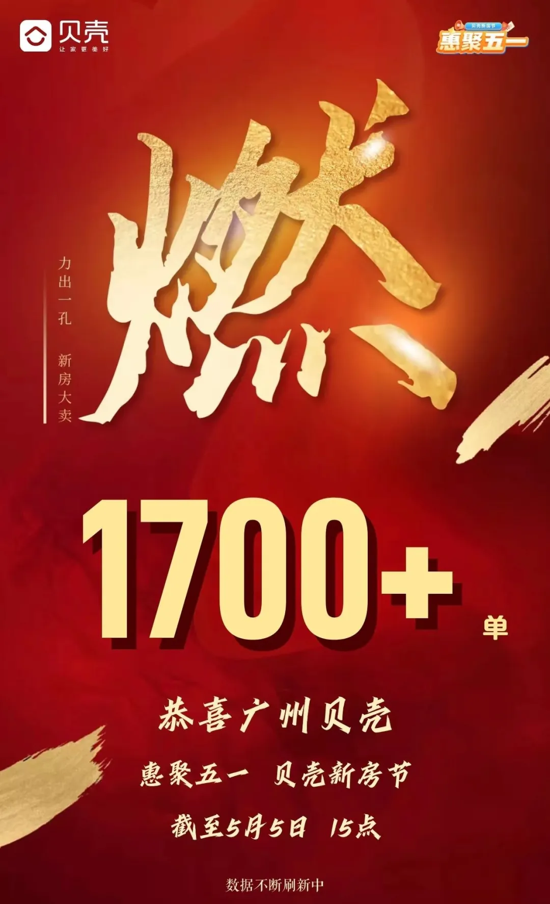 截至5月5日15:00,贝壳新房节突破1700单,平均一天成交近350套。