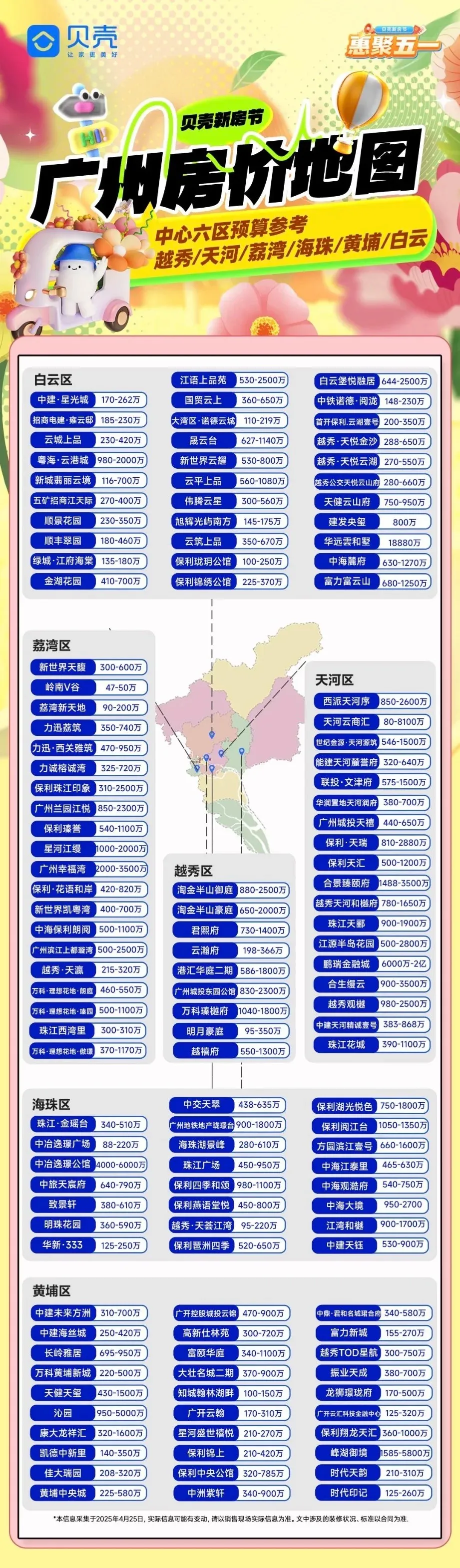 为精准获客,贝壳制作了新房节广州中心六区房价地图,覆盖天河、越秀、荔湾、海珠、白云、黄埔六大区域。房源总价梯度覆盖80万刚需房到2亿顶级豪宅,匹配不同购房需求。