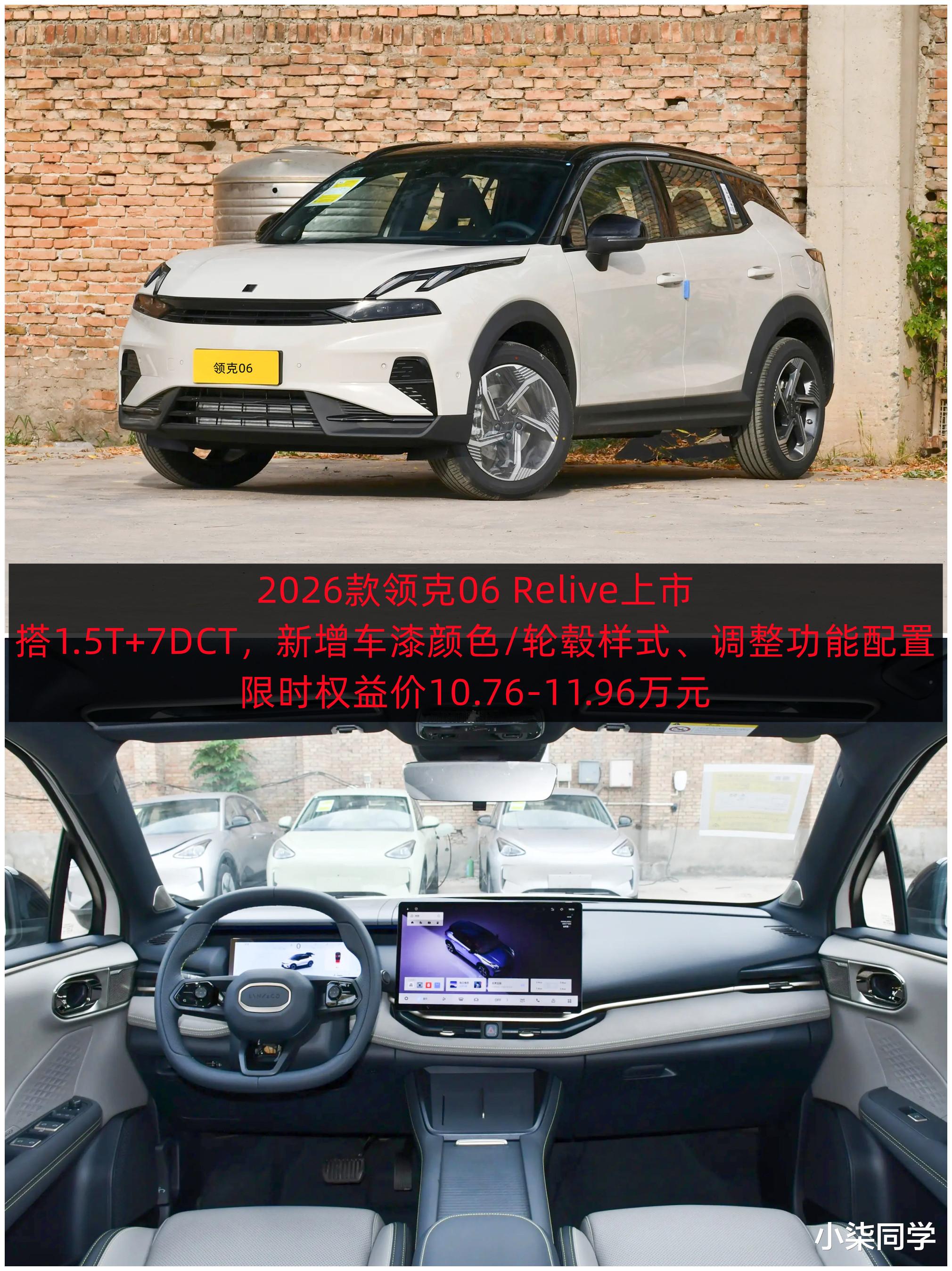 2026款领克06Relive提供2款配置车型,分别为:Max(售价11.76万元)、Ultra(售价12.96万元),限时权益价10.76-11.96万元(相当限时降价1万元)。