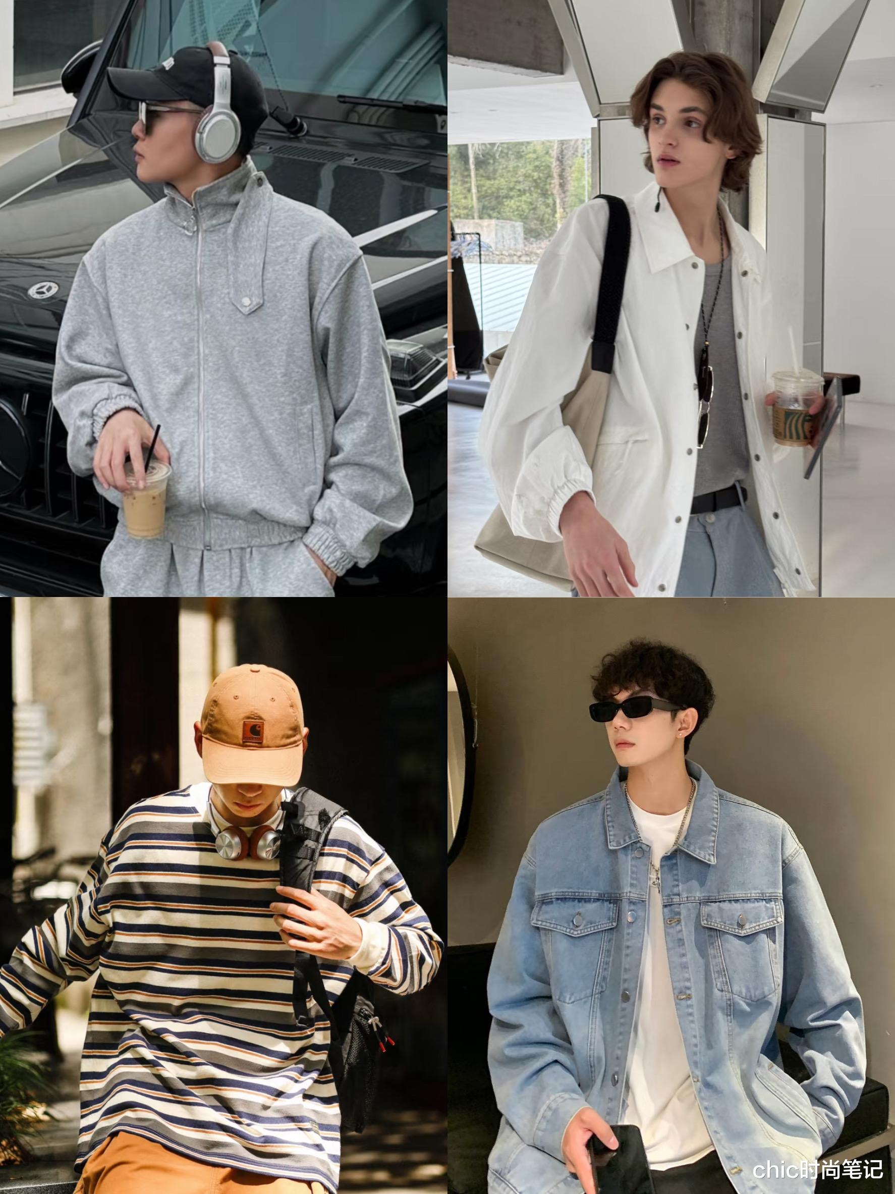 1.上衣类:纯色圆领卫衣、条纹长袖T恤、牛仔夹克、工装衬衫,基本上都是以宽松、大版为主。
