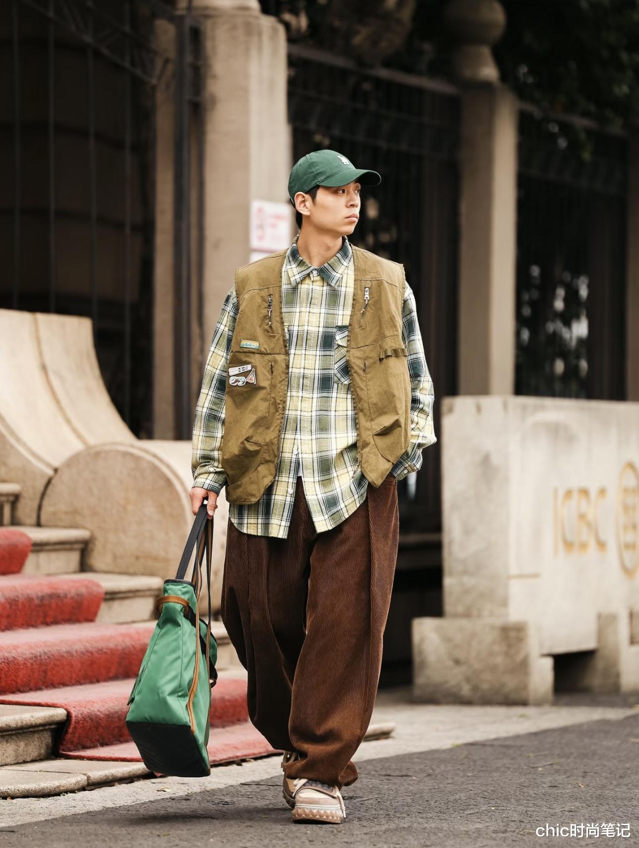 格子衬衫+工装马甲+灯芯绒长裤,搭配帆布鞋/休闲鞋和帆布包,干净清爽但又不失日系温柔氛围感。