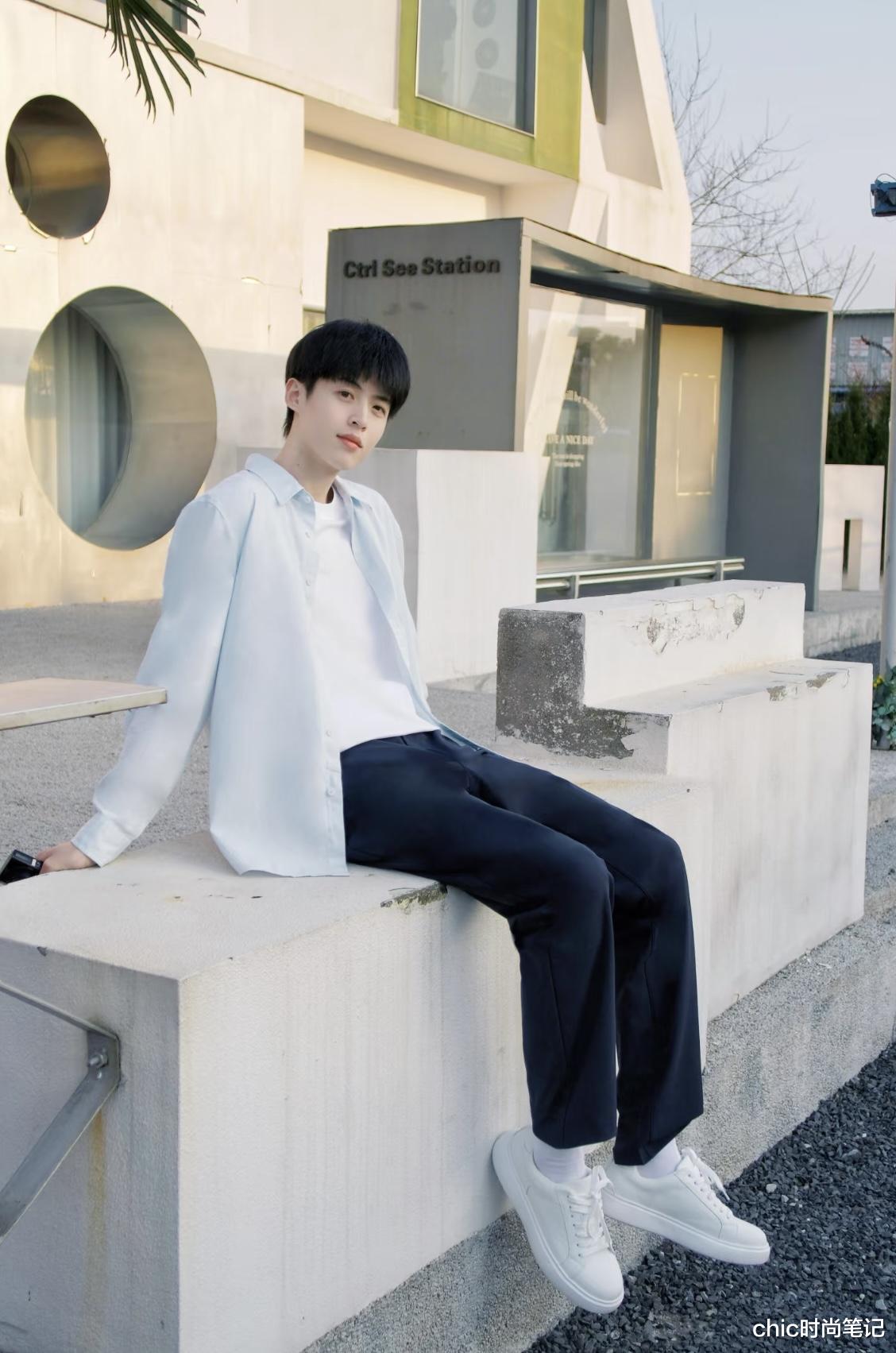 2.衬衫叠穿:浅色系清爽长袖衬衫内搭白T恤,下身再搭配一条西装面料休闲裤+小白鞋,防晒、透气又显层次。