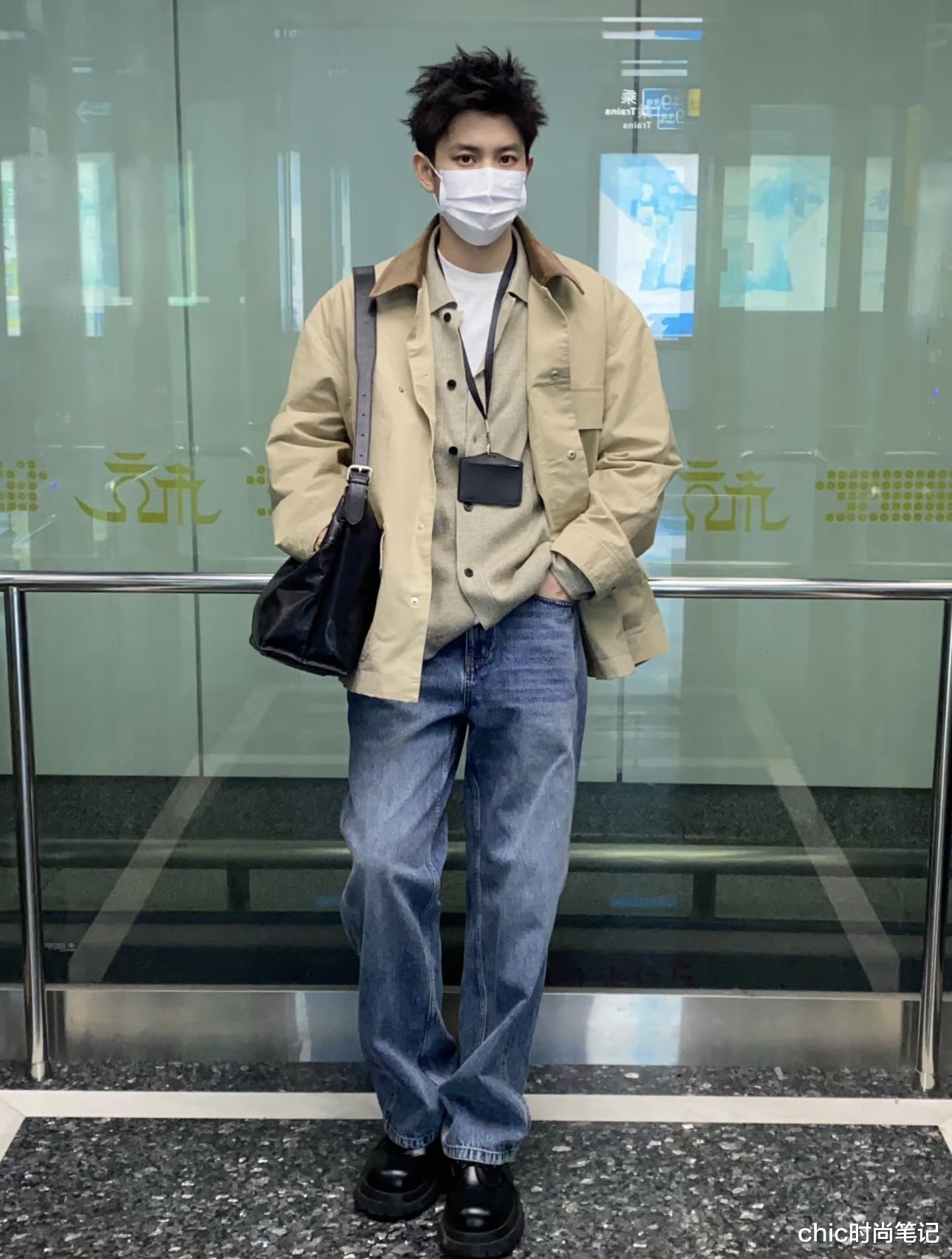 2.摇粒绒外套+阔腿牛仔裤:整体是暖棕色look,保暖又日系,搭配棕黄色毛线帽和米白色帆布包,秒变City Boy风。