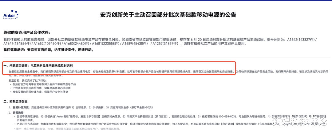 在安克创新的召回公告上也提到了类似的观点:“我们发现某供应商部分批次的行业通用电芯,存在未经批准的原材料变更。”