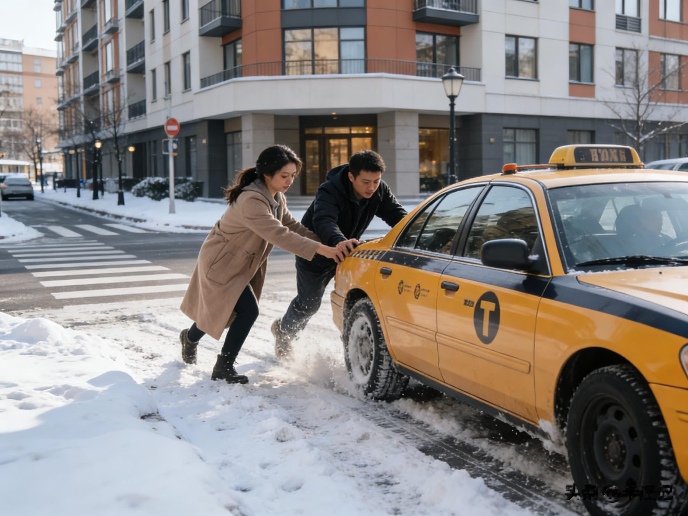 走到十字路口,看见一辆出租车在主干道上打滑,轱辘空转着就是不走,司机急得直打方向盘,后来有个好心人主动上前帮着推了一把,才慢慢挪走。外面太冷,我没多停留,裹紧衣服赶紧往宿舍走。