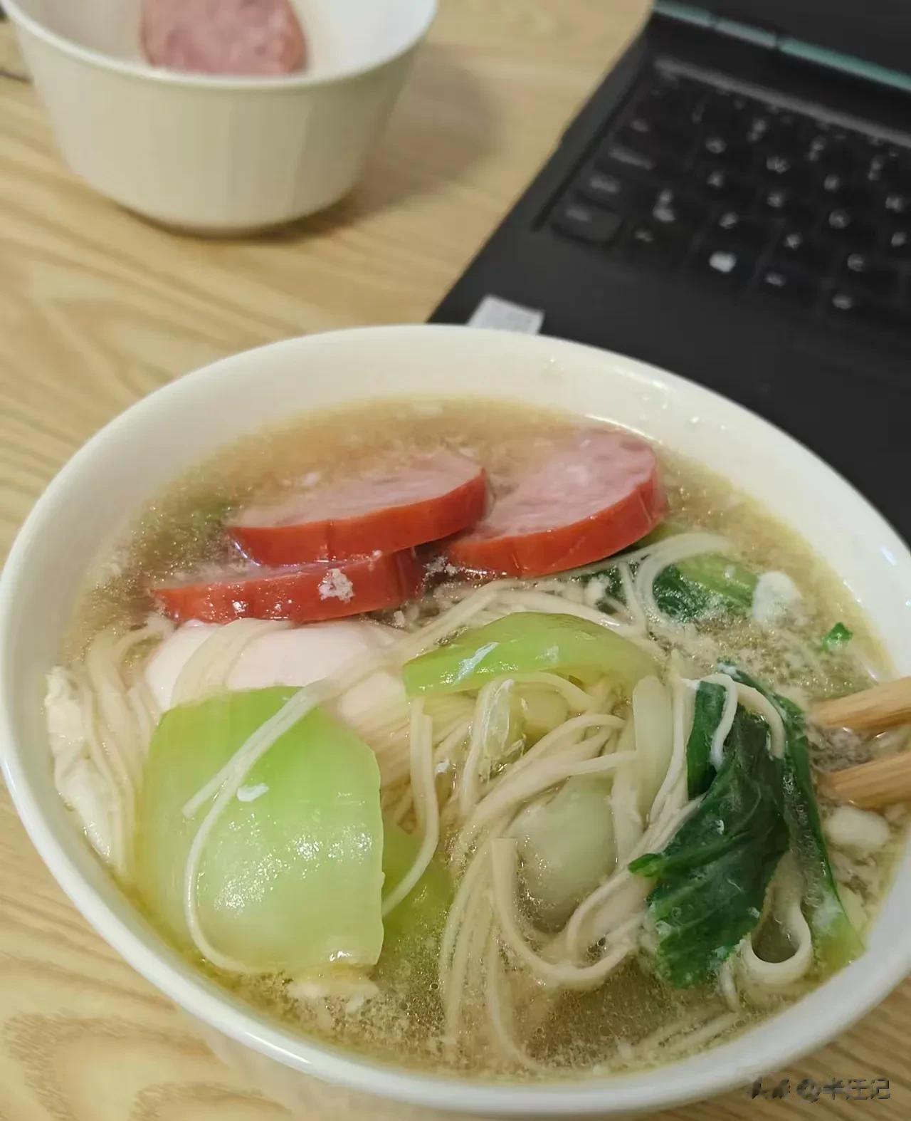 他们那边厨师走了,没人做饭,他自己在公寓下面条,还挺会琢磨,放了个鸡蛋、一根肉肠,拍照片给我看,居然像模像样的。