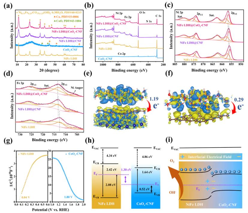 NiFe LDH@CoO-CNF n-p异质结界面表征异质结的稳定性取决于的能量代价。界面处的应变能、极化电荷密度及电偶极矩变化均会影响其形成过程的驱动力。