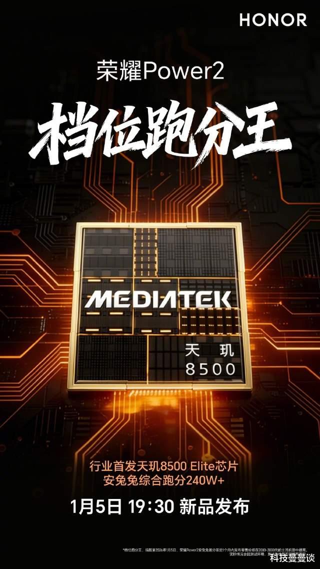 近日,荣耀官宣“户外轻旗舰”荣耀Power2将于2026年1月5日发布。今天,荣耀官宣了该款新机将行业首发全新的次旗舰芯片天玑8500 Elite。
