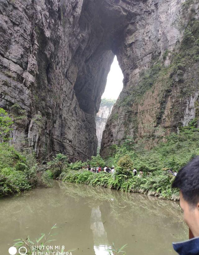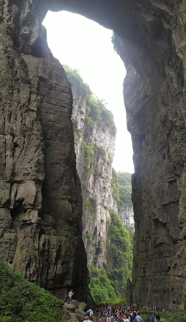 仙女镇附近有好几个独立的景点,我们选取的是天生三桥。购票、上观光车,下车后,通过入口才算正式进入景区。天生三桥是从地面往下走进入深坑的底部,有两个进入方式,一个是乘坐电梯下行,要另外收取15元电梯费(走这个入口的人不多,我后来才弄明白,走这儿才最好,可要多出15元的电梯费)。另一个入口是步行,走的人最多。抱着旅游就是为了走路锻炼身体的心态,同时也是为了省15元的电梯费的目的,我们随着人流缓慢地往坑底移动,大约一个小时左右,我们慢慢吞吞的来到了坑底。