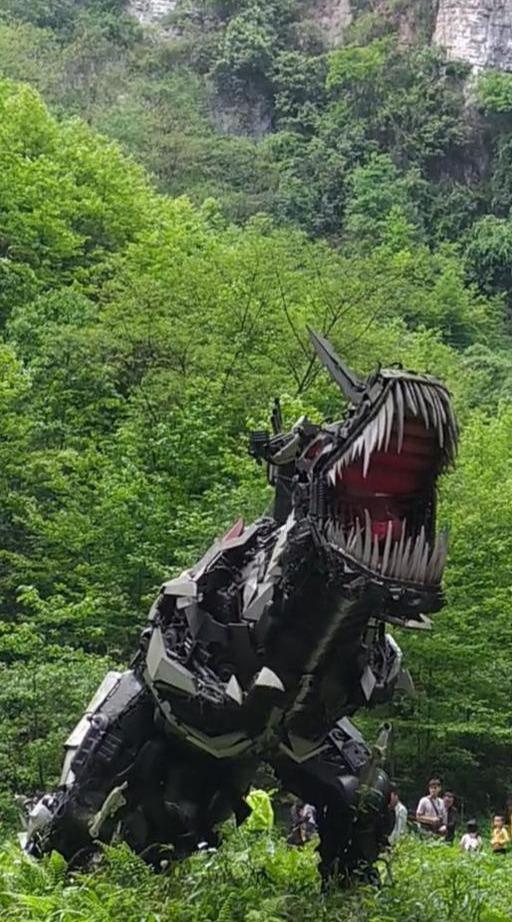 我们首先见到的就是老远就能看见的在坑底中央的平坝上一个巨大的变形金刚的模型,原来这个地方是拍《变形金刚4》的外景地。