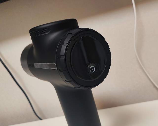 筋膜枪主体同样令人赞叹。它全身大面积采用亲肤软胶材质,触感柔和舒适。990克的重量和紧凑的尺寸设计,使得握持起来既不会感到笨重,又能确保足够的按摩力度。