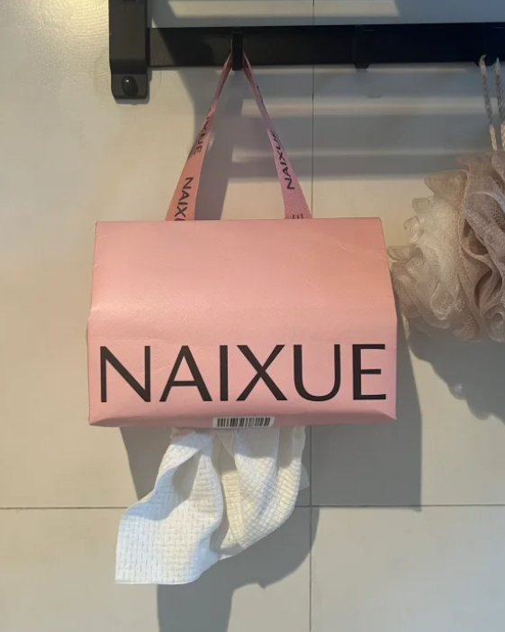 剩下的袋子,下半部分划开一个口子,把纸巾放在奶茶袋子里面,挂在卫生间,每次抽纸都很方便,而且袋子是防水、防潮的,不用担心弄湿。