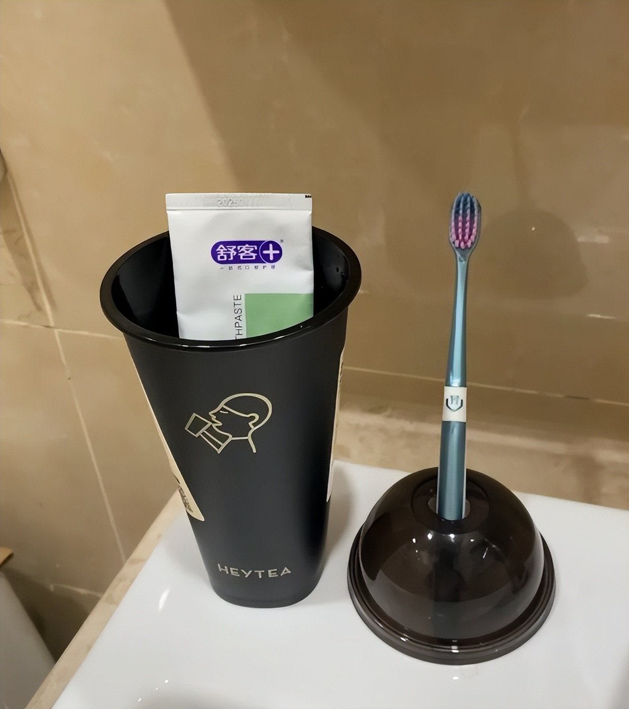 或者,出门的时候没有带漱口杯,一个奶茶杯子也能搞定,喝完的奶茶杯子带去酒店,洗漱的时候用奶茶杯子就不行了吗!