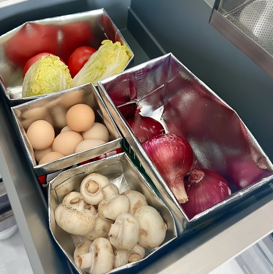 把这些袋子上半部分剪下来,下面放进冰箱里面,可以用来收纳水果、蔬菜,还可以给冰箱做一个区域划分。