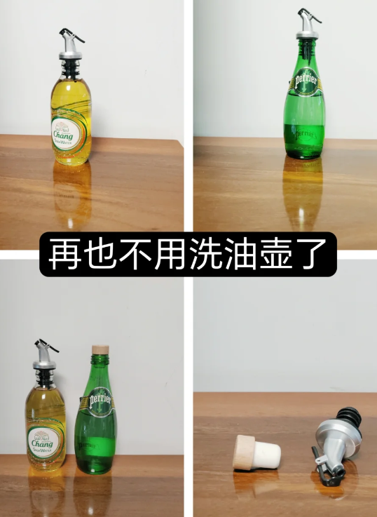 我妈在网上买了几个瓶嘴,固定在玻璃瓶子上面,就把这些瓶子变成了调味料瓶子。