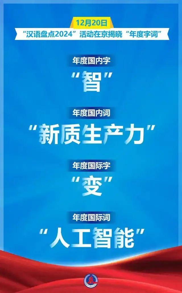 20日,国家语言资源监测与研究中心与商务印书馆等单位联合主办的“汉语盘点2024”揭晓,“智”“新质生产力”“变”“人工智能(AI)”分别当选年度国内字、国内词、国际字、国际词。详情