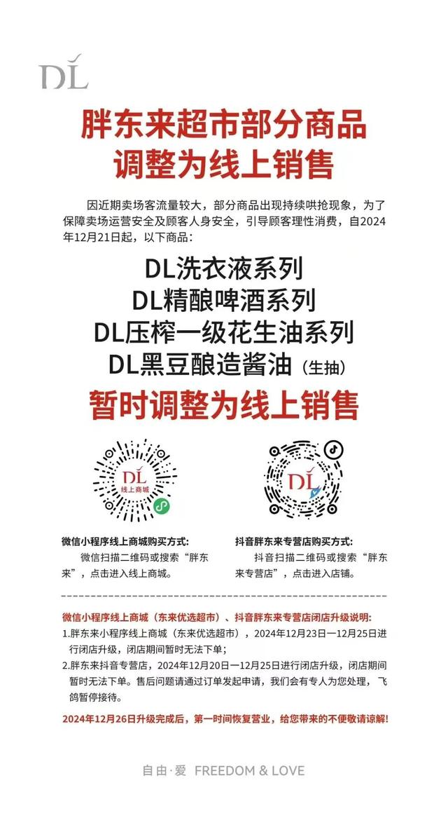 12月21日,胖东来超市又公告新措施,因近期胖东来卖场客流量较大,部分商品出现持续哄抢现象,将部分商品调整为线上销售。详情