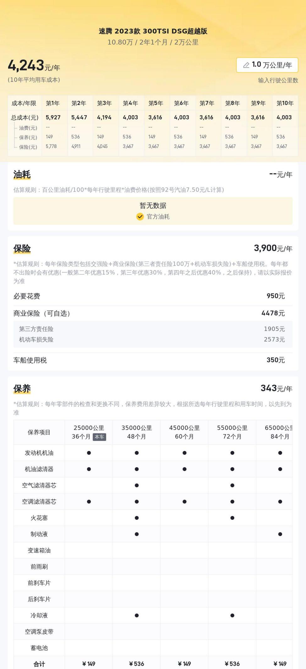 从用车成本来看,速腾的保养费用相对透明,后期维护成本可控。根据估算,年均用车成本约4933元,属于正常水平。5.8L/100km的油耗表现,也有效降低了用车成本。