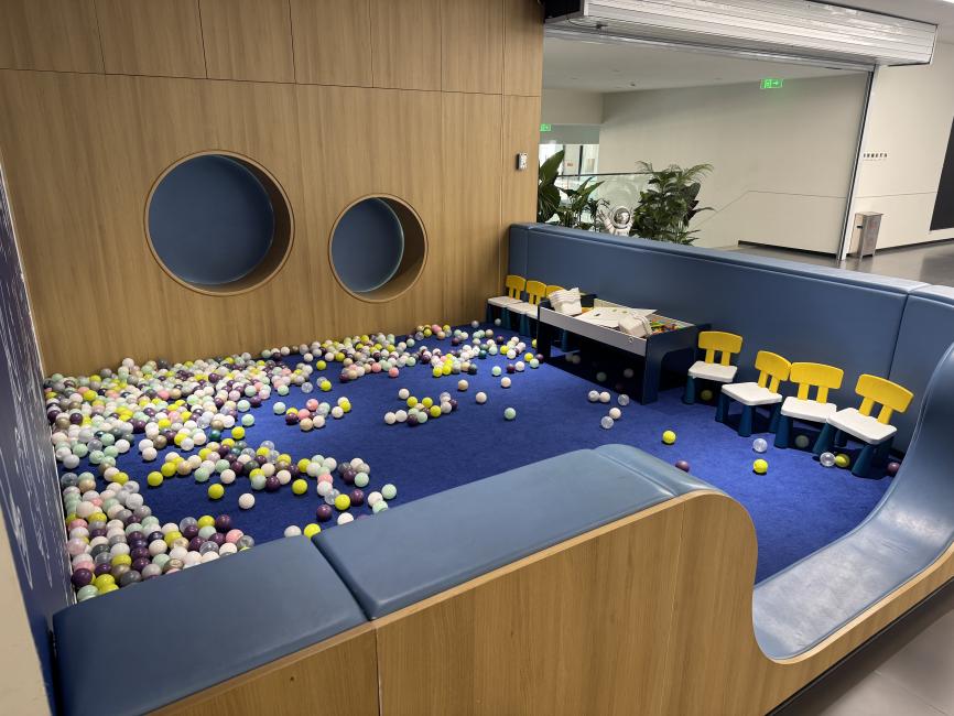 既然体验了售前环节,我便想着也了解一下售后区域的情况。销售很爽快地领我来到餐厅附近的功能区。这里布局集中,一侧是餐饮吧台,饮料茶点均有配备;紧邻着的便是儿童娱乐区,设施丰富且地面墙面都做了软包防护,考虑得很周到。