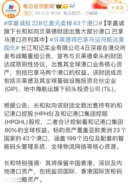 这次,变故,直接打乱了,李嘉诚的,全球,布局,他原本,打算,打包出售,旗下,四十三座,港口,总价,高达,两百二十八亿,美金,如今,核心资产,丢了,交易,也悬了。