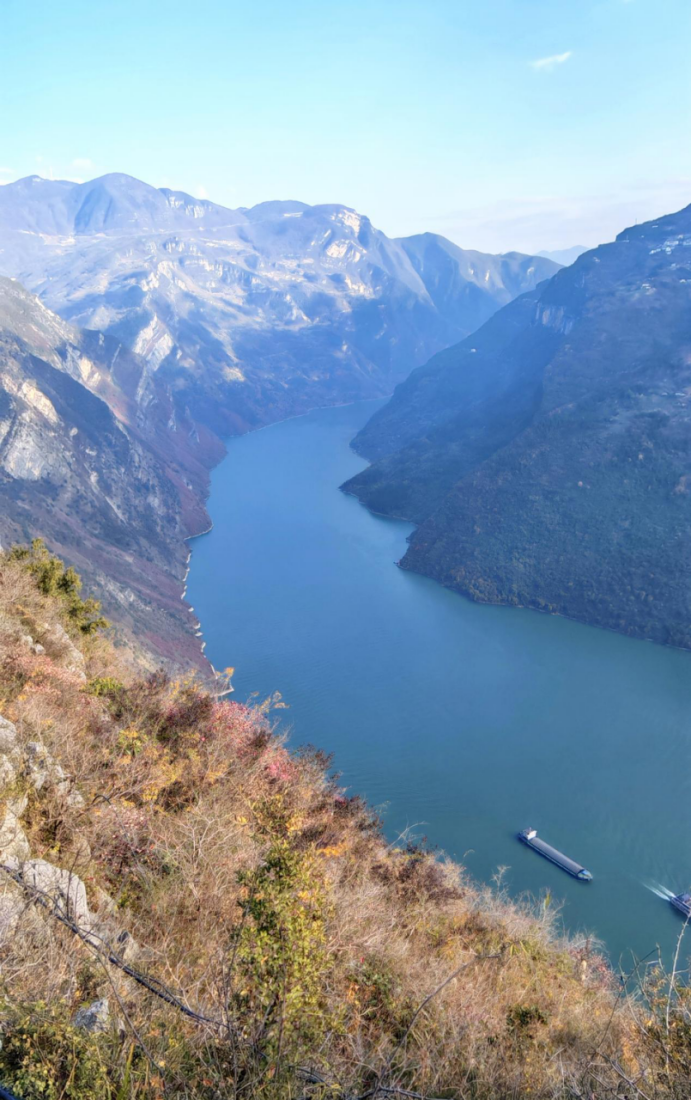 登高极目,步道沿山脊悬崖蜿蜒起伏,宛如一条腾飞的巨龙,雄踞群山之巅,那份巍峨壮阔的气势,令人心生震撼。低头鸟瞰,巫峡就在脚下,长江之水浩荡东去,磅礴壮观!