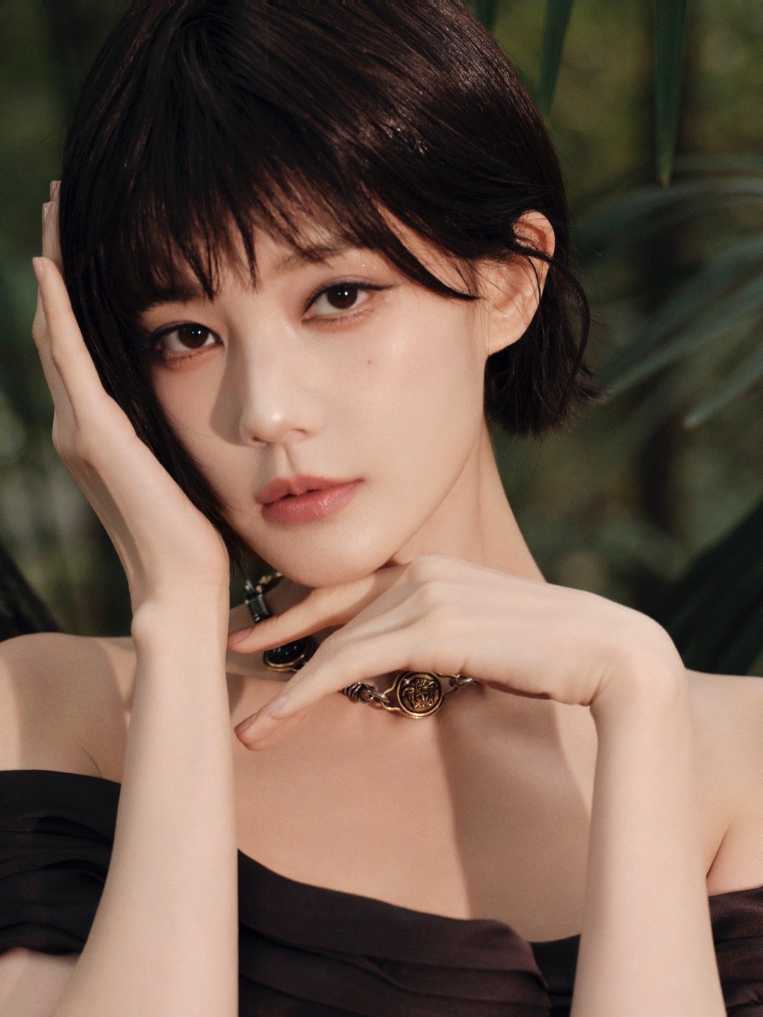 以往提起李一桐,观众脑海中浮现的多是她长发披肩的模样:或是古装剧里温婉灵动的大家闺秀,或是现代剧里明媚甜美的都市女孩,长发的柔婉似乎成了她的“标配”。而此次短发造型的亮相,像是一把剪刀裁开了固有的标签,齐耳的黑发带着细碎的刘海,遮住了几分柔媚,却让她的眉眼更显凌厉。镜头下,她单手撑在粗糙的木墩上,指尖轻触脸颊,眼神清冷地望向镜头,短发的棱角与颈部的金属颈链相映,仿佛乡野间悄然绽放的黑色玫瑰,带着拒人千里的疏离,却又让人忍不住被这份独特的气质吸引。