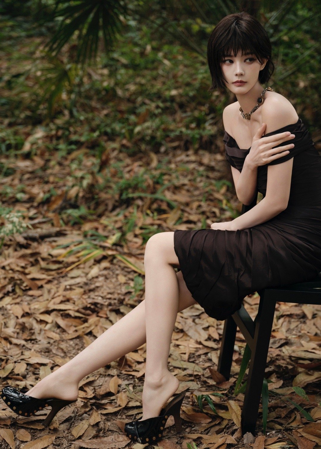 乡野的林径间,落叶铺就成金棕色的绒毯,苍劲的古树撑开墨绿的穹顶,李一桐便站在这自然的画框里,成了最具张力的一笔。黑色褶皱抹胸裙勾勒出利落的肩颈线条,裙摆贴着腰身垂落,将女性的柔媚与野性揉碎在乡野的风里;而一头利落的短发,又为这份风情覆上一层冷艳的薄霜,打破了观众对她一贯的甜美印象,在自然野趣与都市冷感的碰撞中,勾勒出一个全新的李一桐。